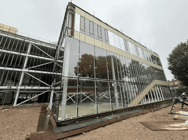 De bouw van het nieuwe Metropolis Lyceum verloopt voorspoedig. Het hoogste punt is bereikt. Deze maand is de laatste vloer gestort en is het betonwerk van het gebouw afgerond. Ondertussen wordt er hard gewerkt aan de montage van de vliesgevels, inclusief het plaatsen van glas en de gekleurde panelen. Ook het dak wordt momenteel waterdicht gemaakt.